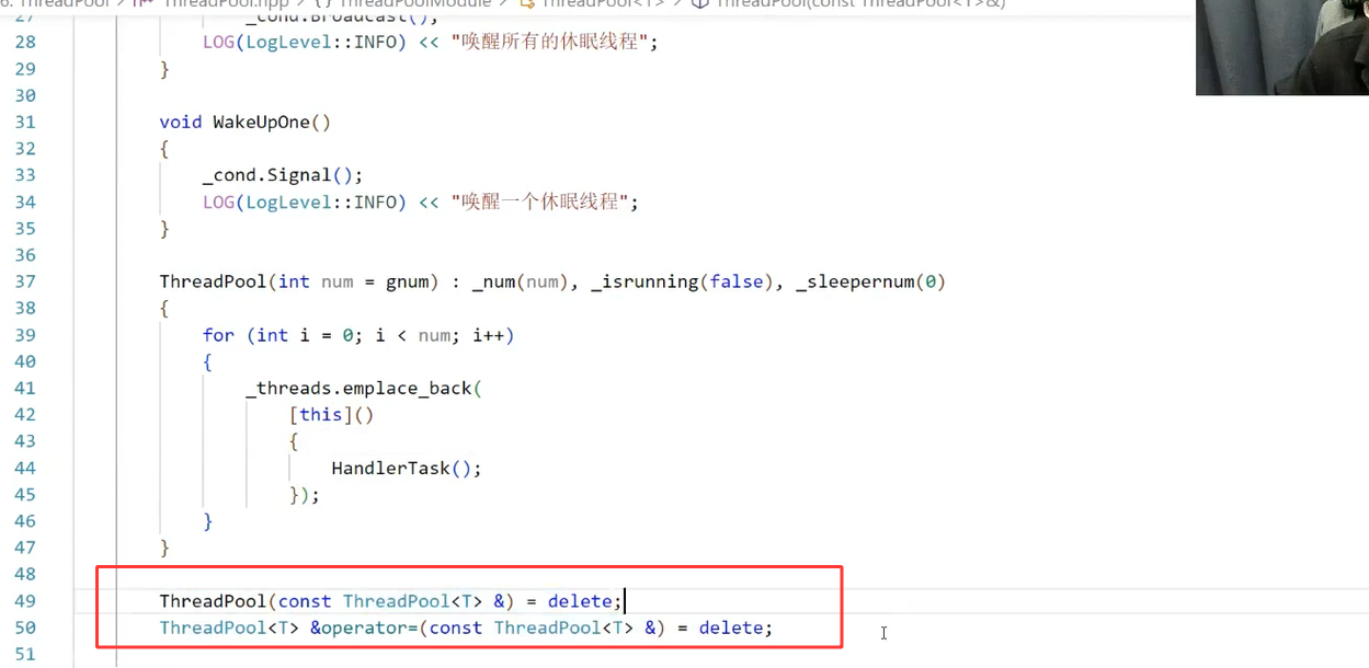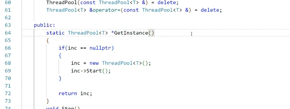 cppprivate: ThreadPool() {} ThreadPool(const ThreadPool&) = delete; ThreadPool& operator=(const ThreadPool&) = delete; -