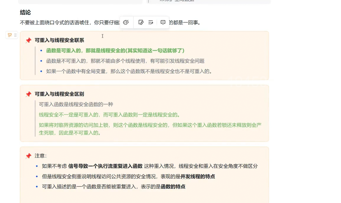 - 一个可重入的函数不一定是线程安全的。例如,一个函数不使用全局变量,但使用了一个共享的、非线程安全的数据结构。它可以被同一个线程重入,但不能被多个线程同时调用。