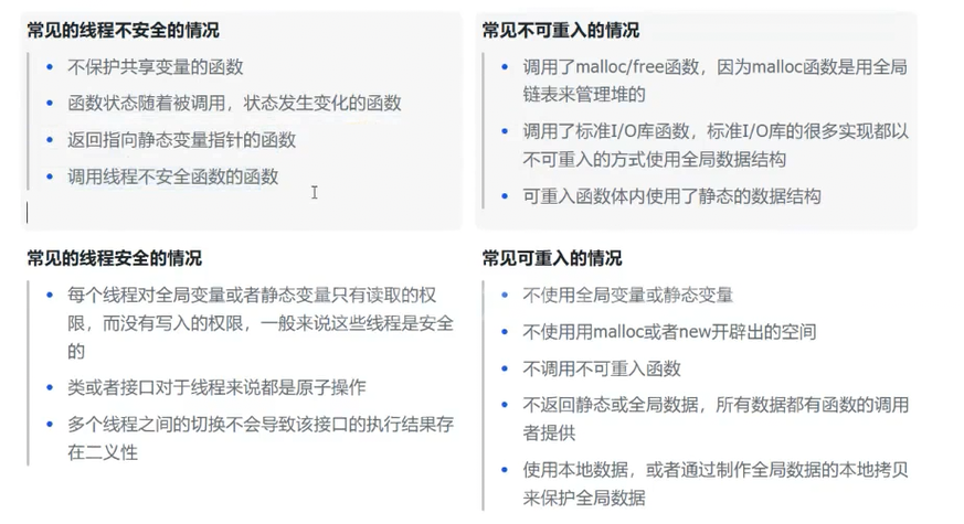 - 一个线程安全的函数不一定是可重入的。例如,一个函数使用了全局锁。多个线程可以同时调用它(因为锁保证了互斥),但同一个线程如果在持有锁的情况下再次调用自己,就会导致死锁,因此它不是可重入的。