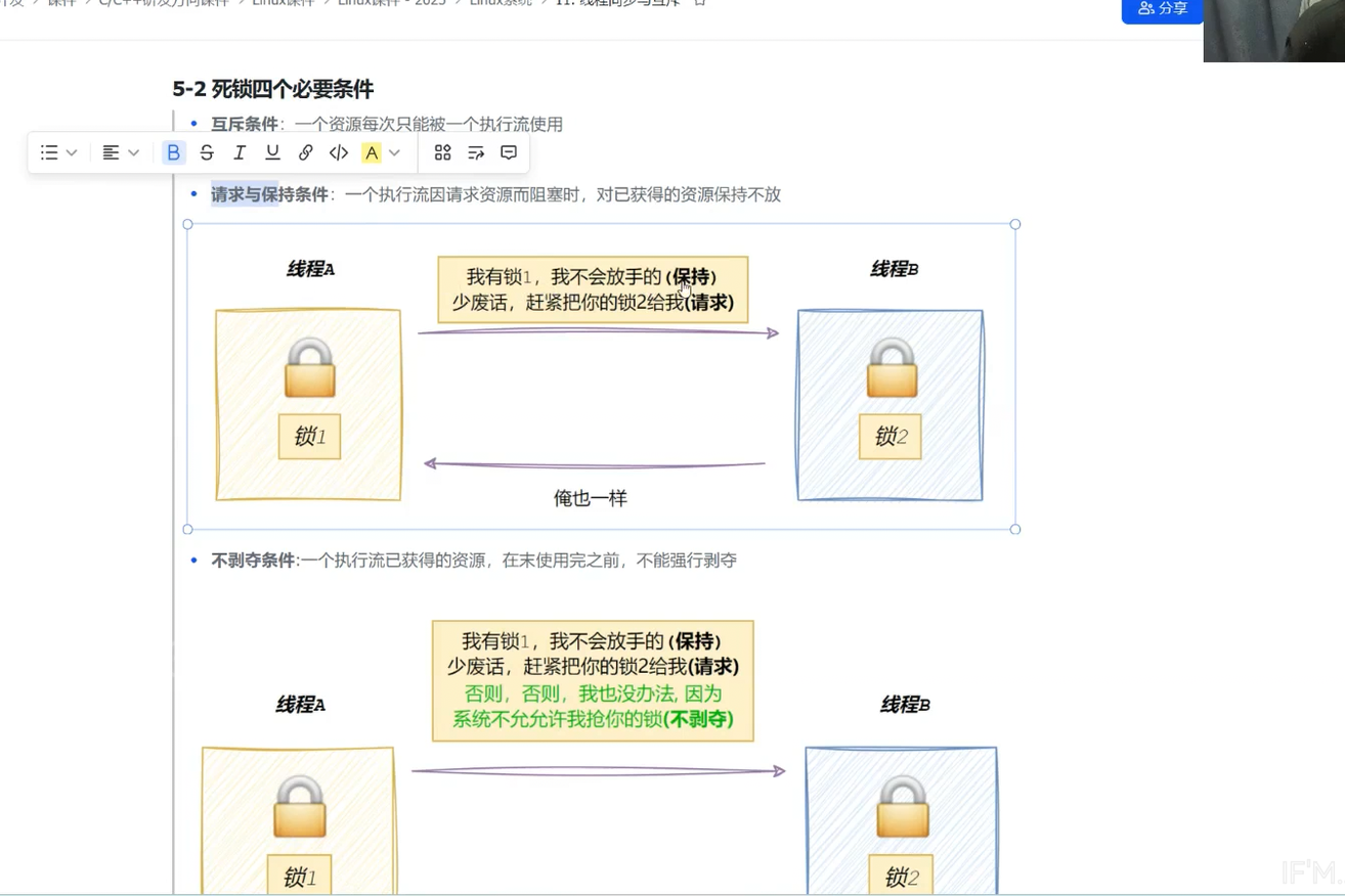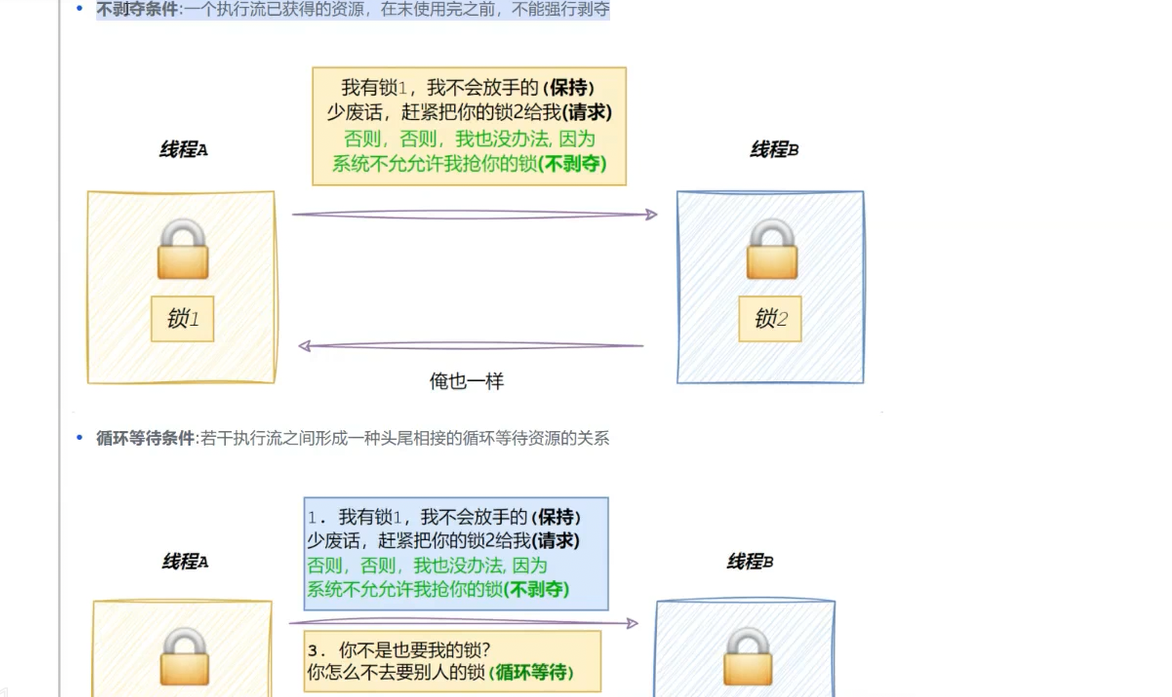 - 请求与保持条件:线程已经持有了至少一个资源,但又提出了新的资源请求,而这个资源已被其他线程占用。