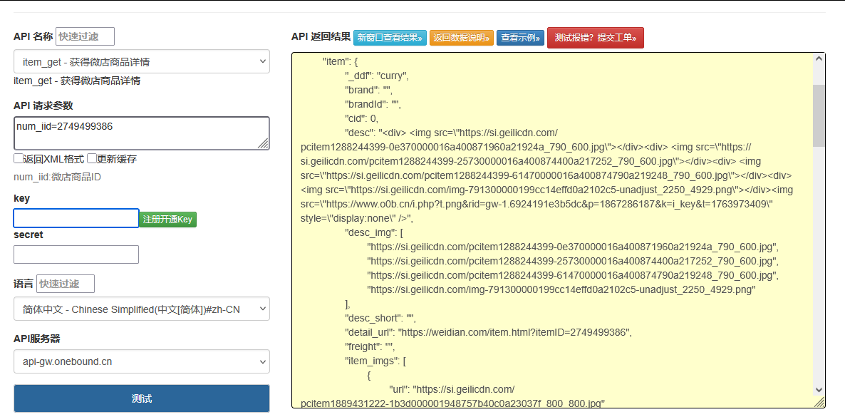 goods_id作为核心参数,可从搜索接口或商品列表接口获取。 - 详情图文接口返回的 HTML 包含商品规格、售后等结构化数据,需通过解析 HTML 提取。