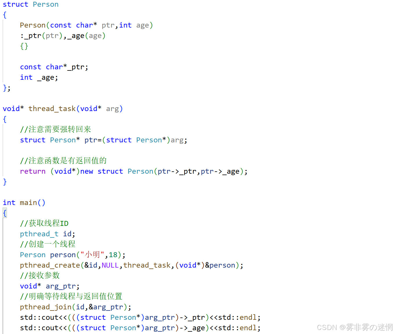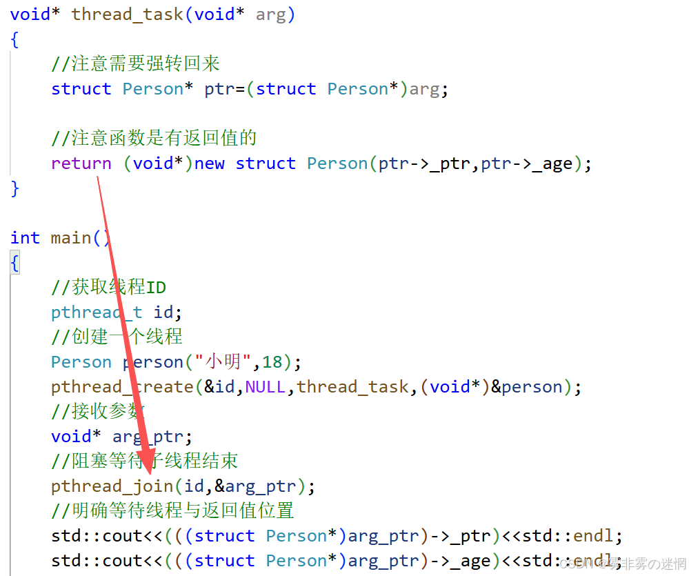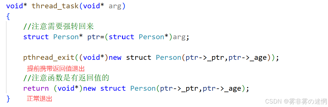 返回值的原理都是一样的:先强转为(void*)指针返回,外面需要有一个接收参数的(void*)指针,同时需要告诉线程返回值存放的位置,拿到之后再强转回来使用