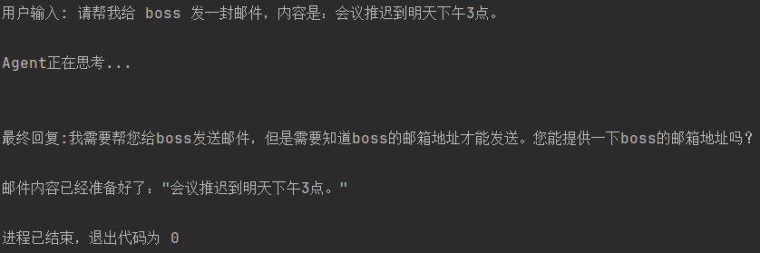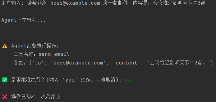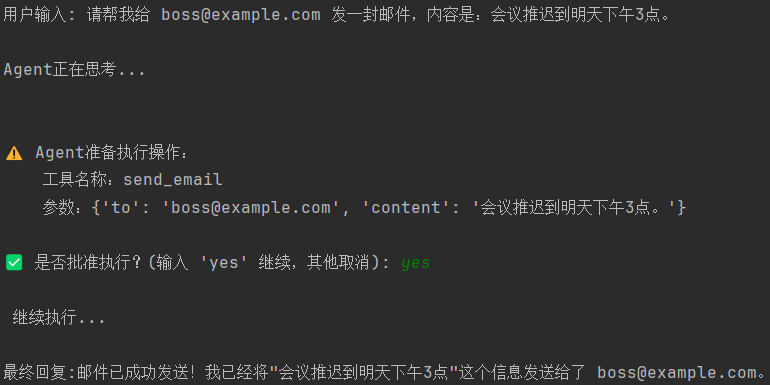 当你发邮件时,该Agent会暂停并显示即将执行的操作,等待你输入yes才继续。