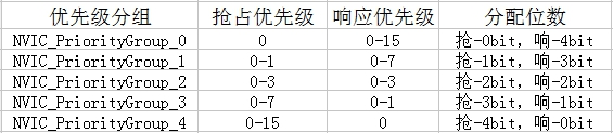 NVIC_PriorityGroupConfig 函数带一个形参用于中断优先级分组, 该值范围可以是 NVIC_PriorityGroup_0-NVIC_PriorityGroup_4, 对应优先级与占用的位数信息如下: