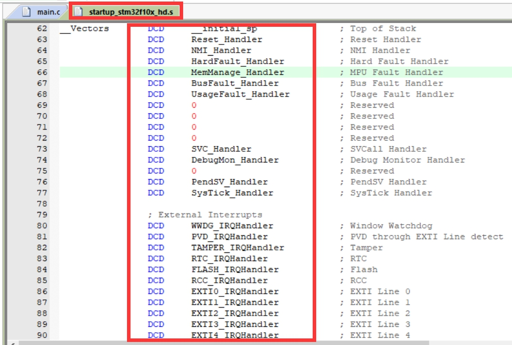 配置好中断后如果有触发, 即会进入中断服务函数, 那么中断服务函数也有固定的函数名, 可以在 startup_stm32f10x_hd.s 启动文件查看, 启动文件提供的只是一个中断服务函数名, 具体实现什么功能还需要我们自己编写, 可以将中断服务函数放在 stm32f10x_it.c 文件内, 也可以放在自己的应用程序中。 通常我们把中断函数放在应用程序中。 这里提醒一下大家, 不要任意修改中断服务函数名, 因为启动文件内中断服务函数名已经固定, 如果要修改, 你还必须在启动文件内把原中断函数修改。 启动文件内中断服务函数名如下: