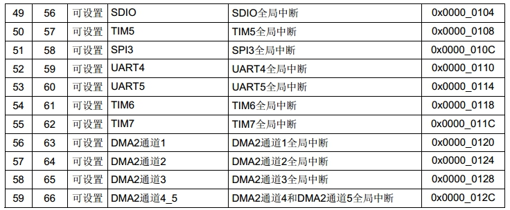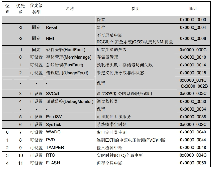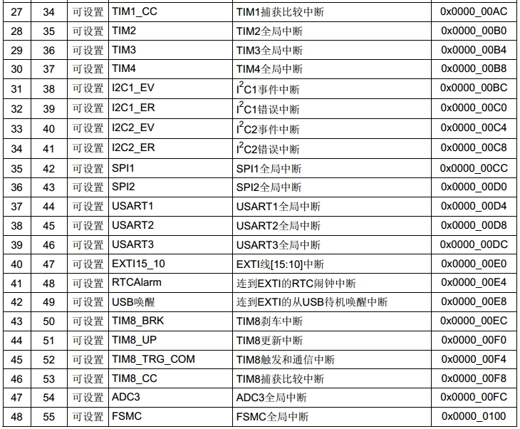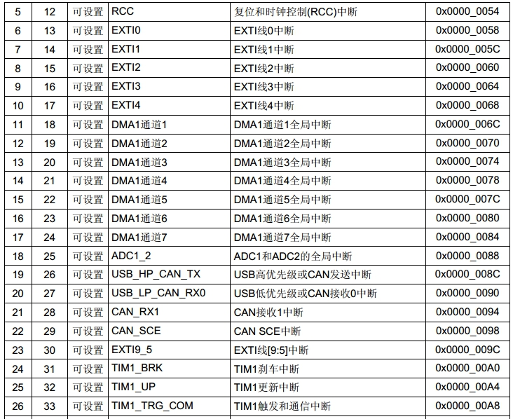 Crotex-M3 内核支持 256 个中断, 其中包含了 16 个内核中断和 240 个外部中断。 但 STM32 并没有使用 M3 内核的全部东西, 而是只用了它的一部分。STM32F10x 芯片有 84 个中断通道, 包括 16 个内核中断和 68 个可屏蔽中断,对于STM32F103系列芯片只有60个可屏蔽中断, 在 STM32F107 系列才有 68 个。除了个别异常的优先级被定死外, 其它异常的优先级都是可编程的。 这些中断通道已按照不同优先级顺序固定分配给相应的外部设备。 从 STM32F10x 中文参考手册的中断向量表可以知道具体分配到那些外设, 这里只截取一部分, 如需了解更详细可参考《STM32F10x 中文参考手册》 -9 中断和事件章节内容, 中断向量表如下图所示: