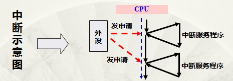 在学习 51 单片机时, 我们就接触过中断, 中断其实就是当 CPU 执行程序时,由于发生了某种随机的事件(外部或内部), 引起 CPU 暂时中断正在运行的程序,转去执行一段特殊的服务程序(中断服务子程序或中断处理程序), 以处理该事件, 该事件处理完后又返回被中断的程序继续执行, 这一过程就称为中断, 引发中断的称为中断源。 比如: 看电视时突然门铃响, 那么门铃响就相当于中断源。有些中断还能够被其他高优先级的中断所中断, 那么这种情况又叫做中断的嵌套。 中断示意图如下图所示: