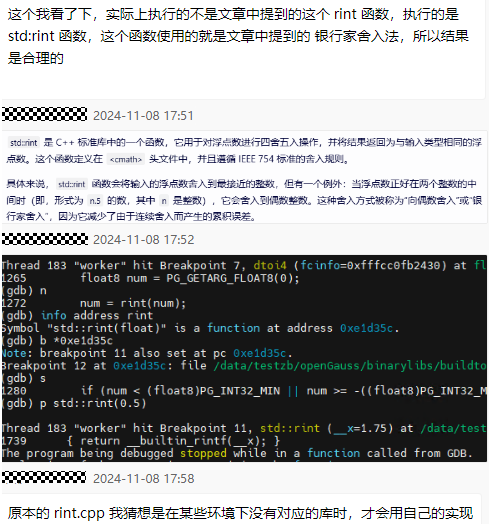 看到这里我一下犯了迷糊,理所当然的认为一定会走到这个rint,但后来根据openGauss社区专家的指点,实际上这里调用的是std::rint(float),c++内置的一个标准函数,而这个函数就是使用的银行家算法!
