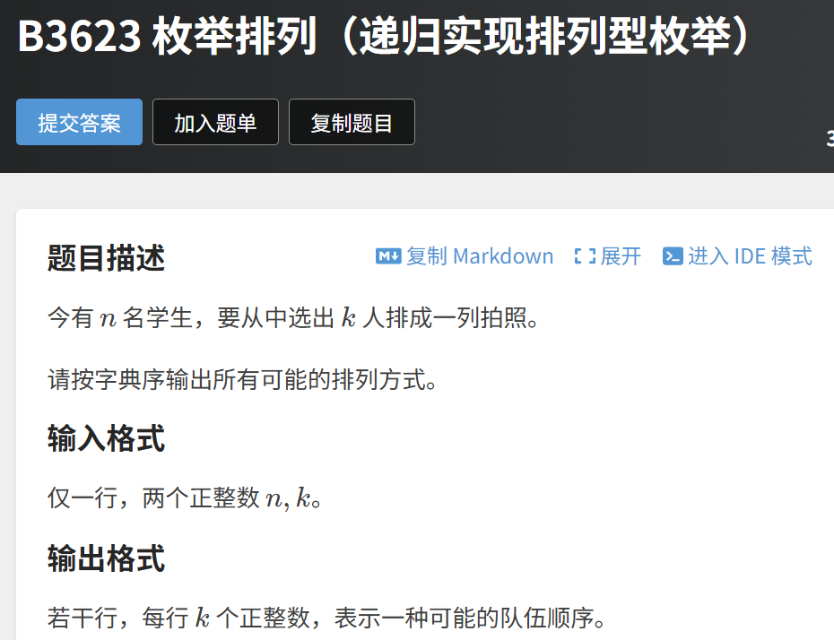 洛谷题目B3623 枚举排列(递归实现排列型枚举)要求:给定 n 名学生,选出 k 人排成一列拍照,按字典序输出所有可能的排列方式。