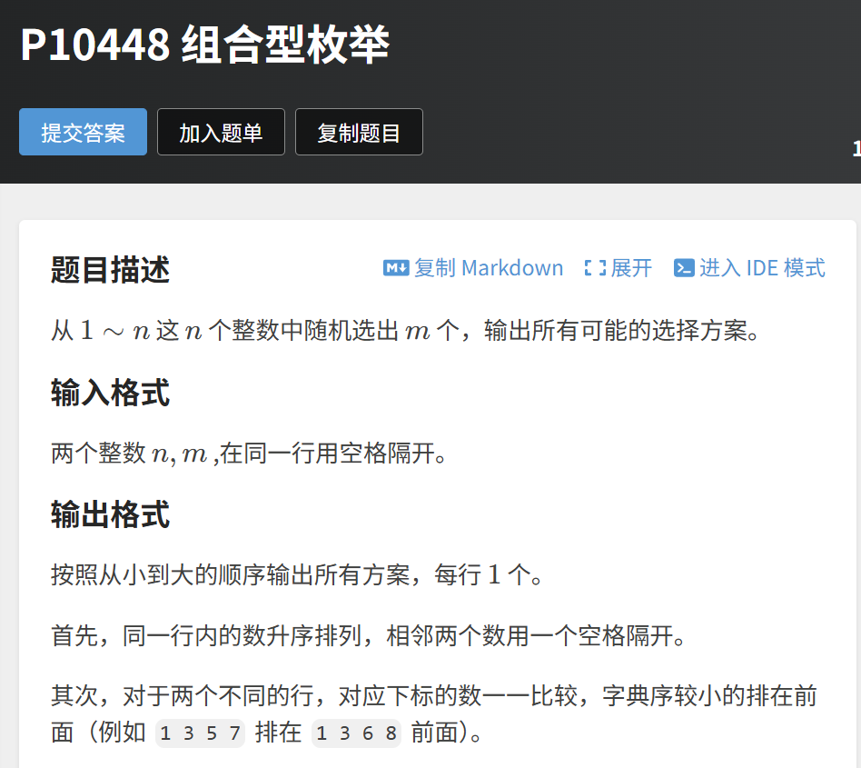 洛谷题目P10448 组合型枚举要求:从 1~n 这 n 个整数中随机选出 m 个,按字典序输出所有可能的组合方案。同一行内的数升序排列,不同行按字典序排序。
