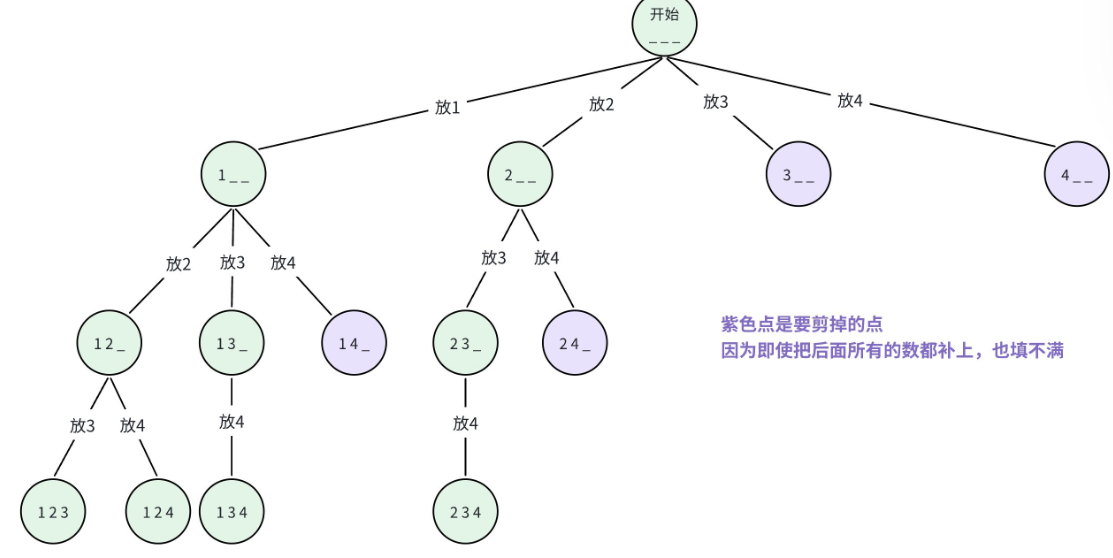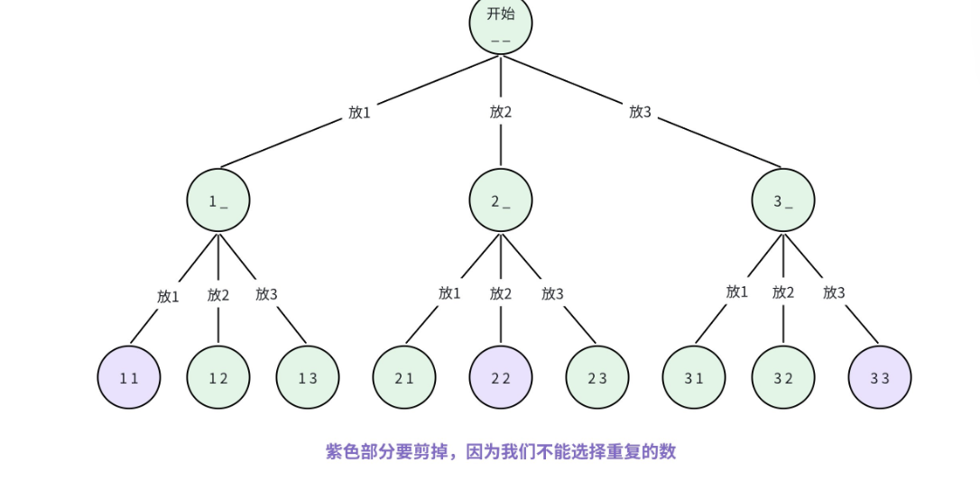其中,紫色的分支(选过的数再次被选)需要剪掉,比如选了 1 之后,不能再选 1,因此 1 下面的 1 分支要剪掉。