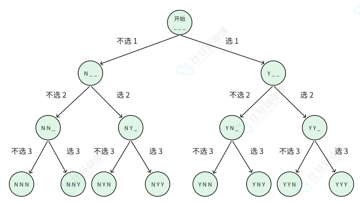 - 递归过程:先执行 "不选" 操作,将 'N' 加入路径,递归处理下一位;再执行 "选" 操作,将 'Y' 加入路径,递归处理下一位。