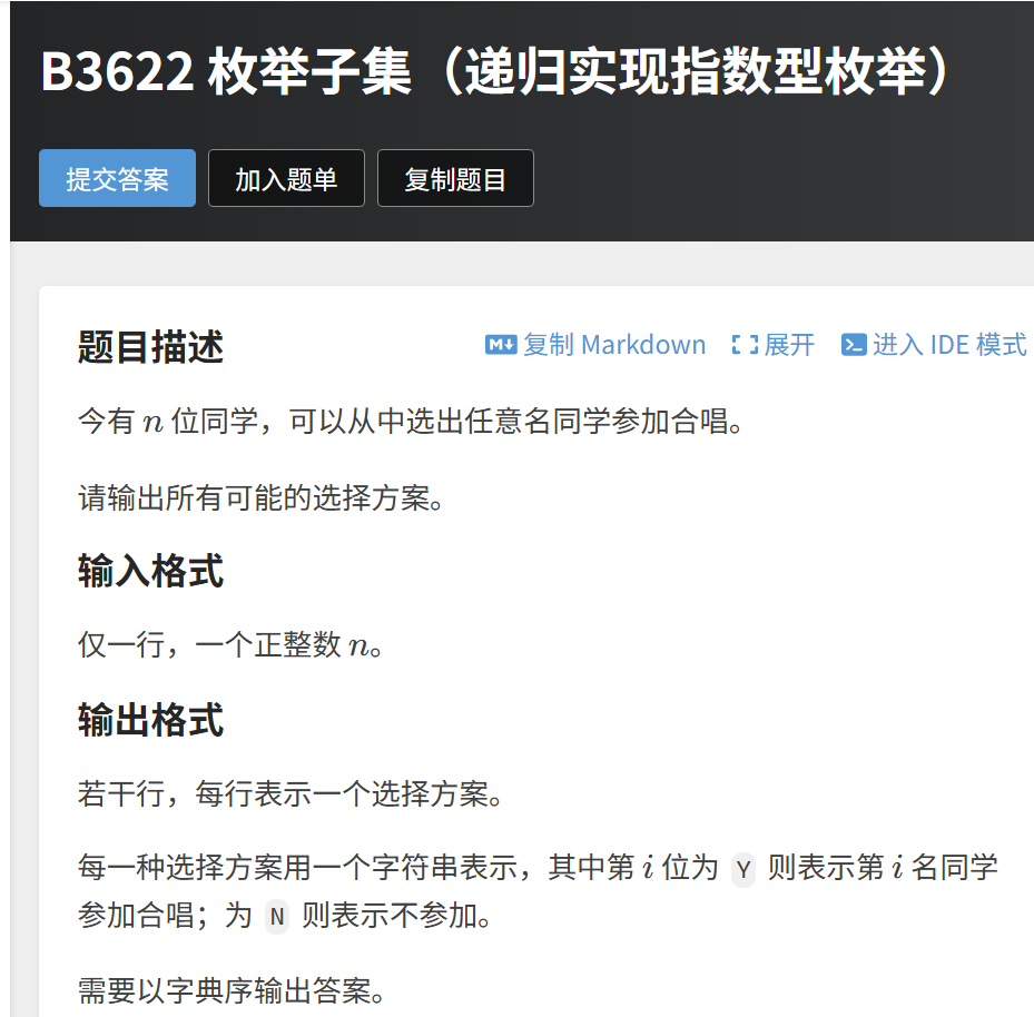 这是洛谷的经典入门题B3622 枚举子集(递归实现指数型枚举),题目大意是:给定 n 位同学,从中选出任意名同学参加合唱,输出所有可能的选择方案。每个方案用字符串表示,第 i 位为 Y 表示第 i 名同学参加,为 N 表示不参加,结果按字典序输出。
