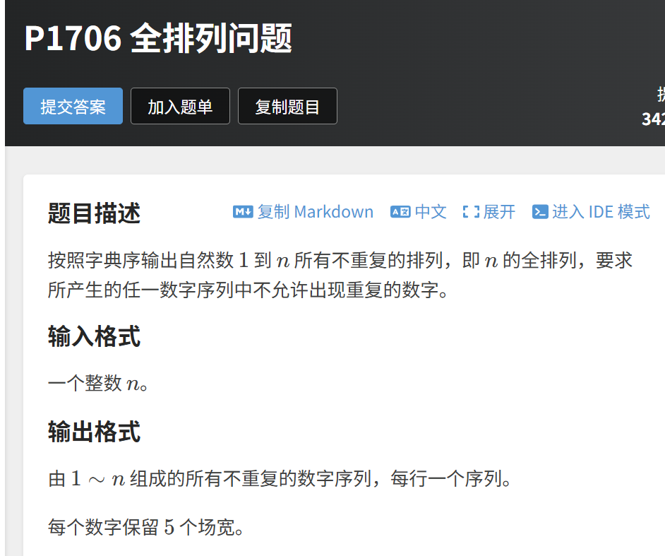 洛谷题目P1706 全排列问题要求:按字典序输出自然数 1 到 n 的所有不重复的排列,每个数字占 5 个场宽。