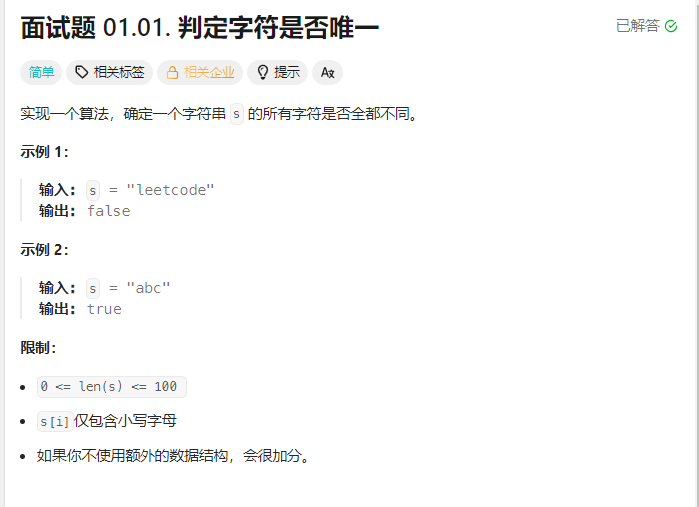 我们可以用位图的思想来解决这道题:找一个32位比特位的数字,这32个比特位用来表示字符是否存在,例如:000000.....0000 假设有个字符 a,如果位图的第 a - a 个位置,也就是第 0 个位置是否为 0 ,如果是0,就把这个位置改成1,表示 a 这个字符是存在的,假设再出现出现一个字 a ,我们也还是判断第 a - 'a' 这个位置是否为0,此时是不为0,所以我们返回 false ,因为字符重复了。