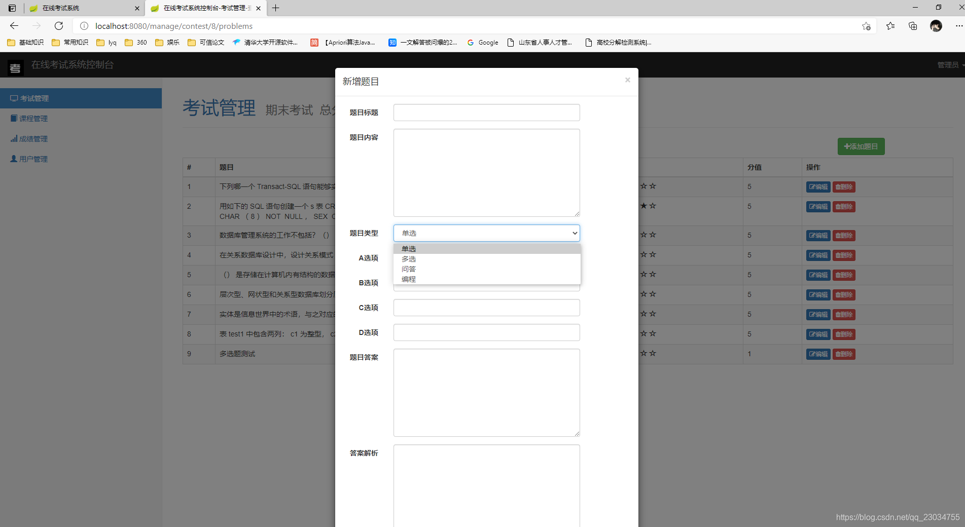 `question_type` int(8) NULL DEFAULT NULL COMMENT '题目类型,0表示单项选择题,1表示多项选择题,2表示问答题,3表示编程题',