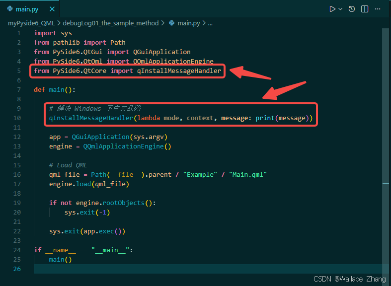 如上所示,在main.py增加代码qInstallMessageHandler(lambda mode, context, message: print(message))。