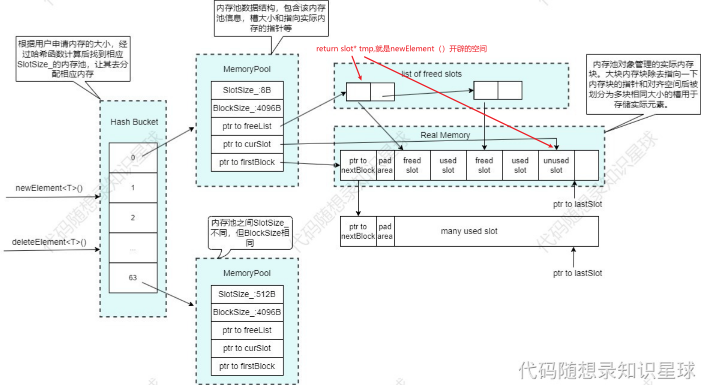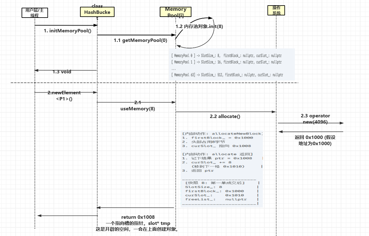 allocateNewBlock()结束后,回到allocate中,把P1类型放入第一个槽中,curSlot_再次后移,返回指向第一个槽的指针给useMemory(),再返回给newElement()。- newElement()就