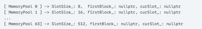 BenchmarkMemoryPool(100, 1, 10); 进入P1* p1 = newElement<P1>();- 假设sizeof(P1) 是 8字节(对应 0号池子,SlotSize=8)