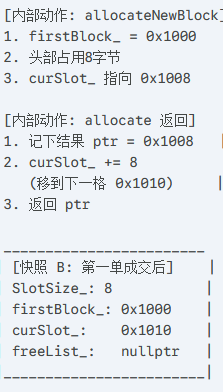 freeList_是 nullptr? 是。(没人退货),curSlot_是 nullptr 吗? 是。(还没进过货),curSlot==lastSlot,触发allocateNewBlock(),进入allocateNewBlock()- 调用系统: operator new(4096)。更新firstBlock_,curSlot_,lastSlot_。