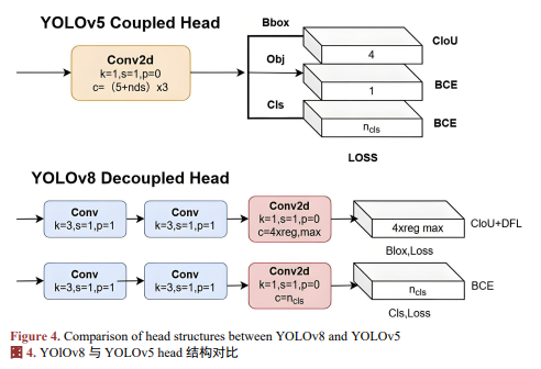 - YOLOv8的头部网络是目标检测最后一环,位于颈部网络之后,负责处理多尺度特征图以生成目标分类概率与边界框坐标。如图4所示。