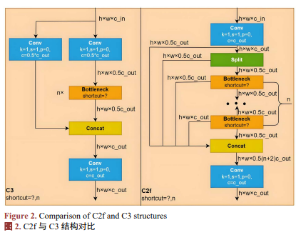 - 网络架构上,骨干网络用C2f模块替换常用的C3模块,如图2所示。