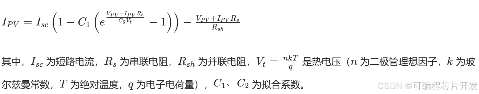 采用Trina Solar TSM-250PA05.08光伏组件,由14个组件串联为1个支路,且仅1个支路并联。光伏组件的输出特性受"辐照度(Irradiance)和温度(Temperature)"影响,其输出功率 - 电压(P−V)曲线存在唯一的最大功率点(MPP),系统的核心目标之一就是追踪该点以最大化发电效率。 光伏阵列的输出电流I PV和电压V PV满足其自身的特性方程,在工程建模中可通过厂家提供的参数拟合得到,一般形式为: