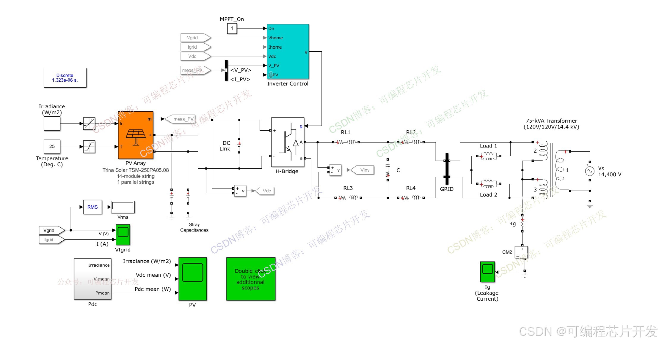 由RL元件构成的滤波网络(RL1、RL2、RL3、RL4)用于滤除逆变器输出的高频谐波,使并网电流满足电网的谐波标准。之后通过配电线路连接负载(Load 1、Load 2)和变压器,最终并入电网(VS =14,400V)。 无变压器设计(图中虽有变压器但属于电网侧配电,光伏并网环节无变压器)的优势是提高效率、降低成本与体积,但需注意共模电流等问题(图中CM2用于监测漏电流Ig)。