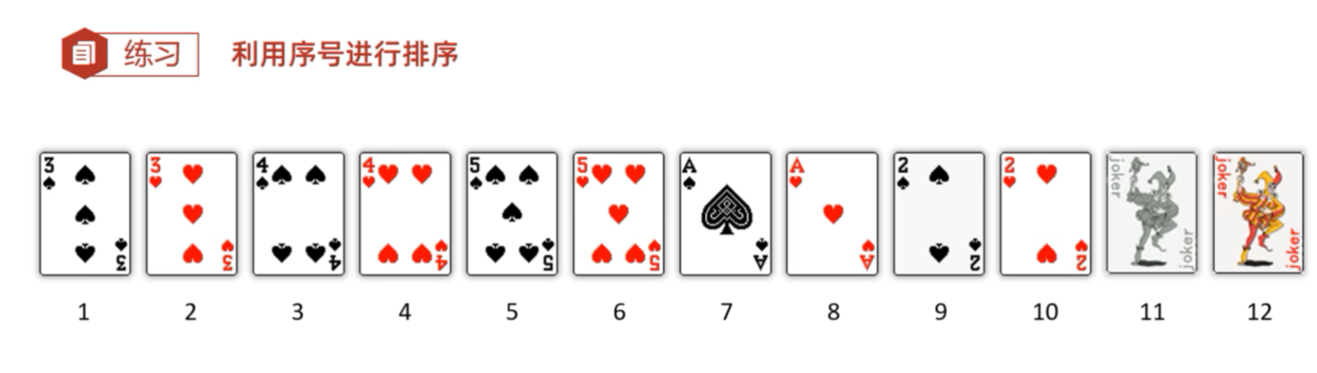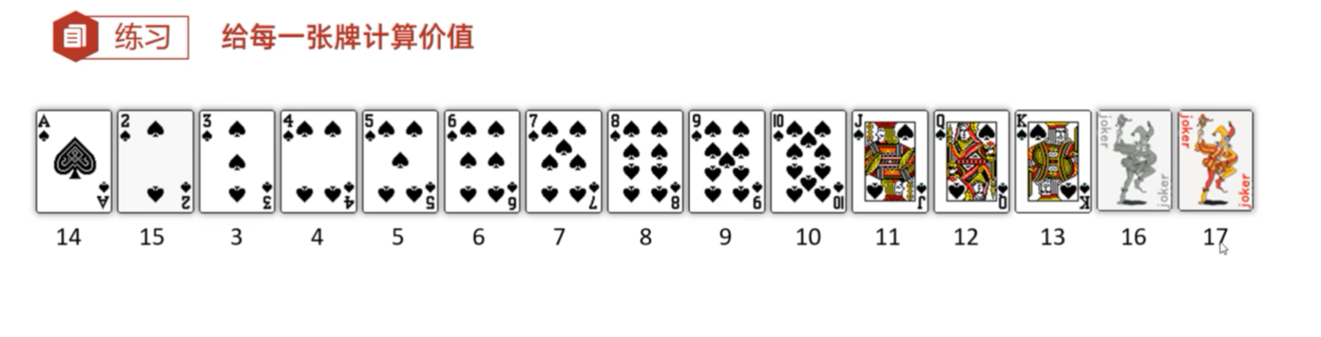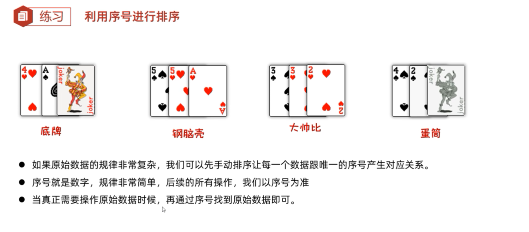 先手动进行排列,然后再跟12345678910这样的数字一一对应,这样对应起来之后,数字越大,我们认为牌面就越大。那么我们判断大小、洗牌等操作,实际上操作的就是下面的序号!