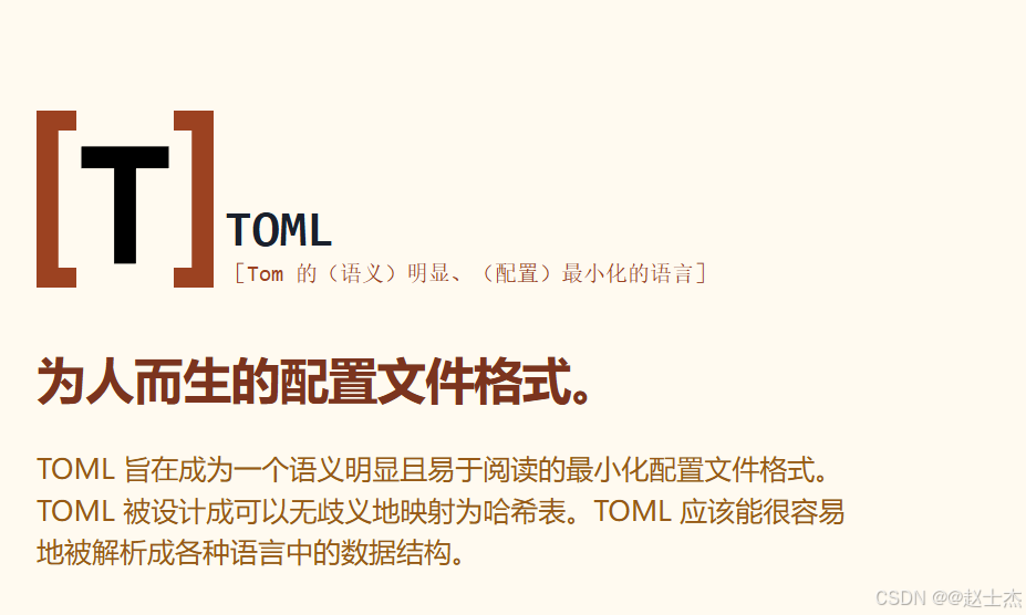 TOML(Tom's Obvious, Minimal Language)类似于 JSON 或 YAML,常用于存储配置数据,但语法更简洁,旨在替代语法冗余的 JSON 或功能有限的 INI,成为最小化、易读、无歧义的配置文件格式。