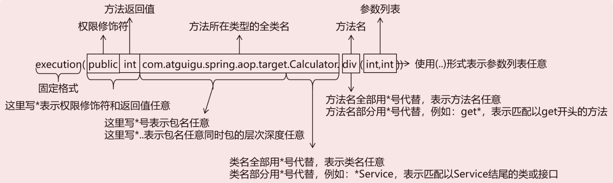 javapackage com.jxnu.pointCut @Component public class XxxPointCut{ @Pointcut(value="execution(* com..Impl.*.*(..))") public void pc1(){} @Pointcut(value="execution(public int com.jxnu.Entity.Impl.CalculatorImpl.*(..))") public void pc2(){} } -