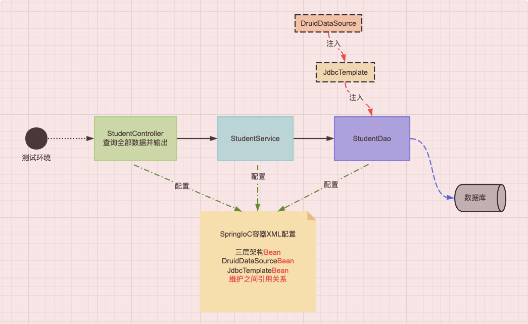 spring//创建ioc容器对象,指定配置文件,ioc也开始实例组件对象 ClassPathXmlApplicatonContext applicationcontext = new ClassPathXmlApplicationContext("services.xml","daos.xml"); //获取ioc容器的组件对象 PetStoreService service = applicationcontext.getBean("petstore",PetStoreService.class); //使用组件对象 List<String> userList = service.getUsernameList();