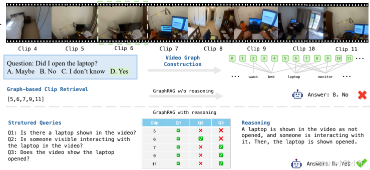这个例子中,AI原本被多个打开笔记本电脑的片段干扰,错误地回答"没有打开电脑"。但经过结构化审问后,它成功识别出关键的开机动作,给出了正确答案。