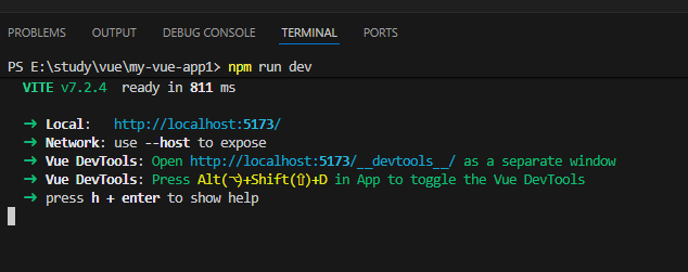 在VSCode最上面一排的工具栏Terminal-->new terminal打开一个新终端,运行npm run dev 服务就起来了,你可以在浏览器熵输入地址 http://localhost:5173/ 就可以看到欢迎页面了。到此为止,整个开发环境就搞起来了。