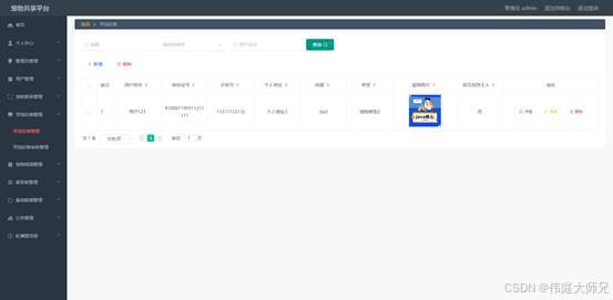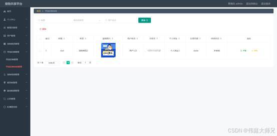 图5.2 即为编码实现的宠物寄养审核管理界面,管理员在该界面中对用户申请领养的宠物进行线上审核,管理员对宠物寄养的信息审核通过之后,该宠物的领养状态就是被领养的状态了。