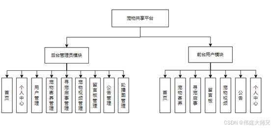 用户权限操作的功能包括申请领养宠物,申请认领宠物,查看申请的宠物寄养或申请的寻宠启事的审核状态,发布留言板,查看或对宠物视频进行收藏以及留言。图4.1为系统整体功能结构图。