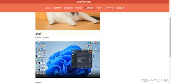 图5.8 即为编码实现的宠物视频界面,用户在该界面中主要就是播放宠物视频,在宠物视频下方发布留言,该宠物视频也支持用户在当前页面进行收藏,方便下次查看。