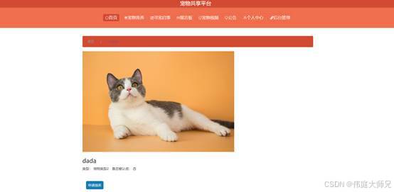 图5.6 即为编码实现的宠物寄养界面,用户在该界面中查看宠物寄养的介绍信息,只能对未被领养的宠物进行申请领养,已经被领养的宠物只能查看其介绍信息。