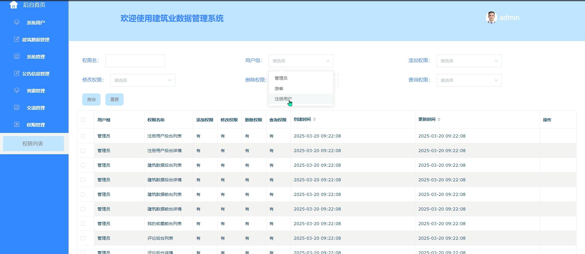 - 建筑数据查询:按项目名称、地点、规模等查询建筑项目数据,按材料名称、规格、价格等查询材料数据,支持模糊查询与多条件筛选。