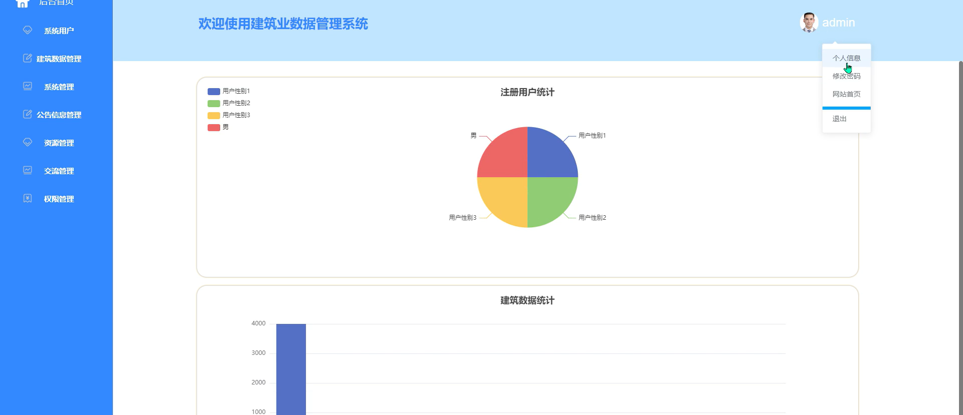- 统计图生成:生成数据量、建筑用材消耗量、用户活跃度等统计图表,支持多时间范围筛选、导出与打印。
