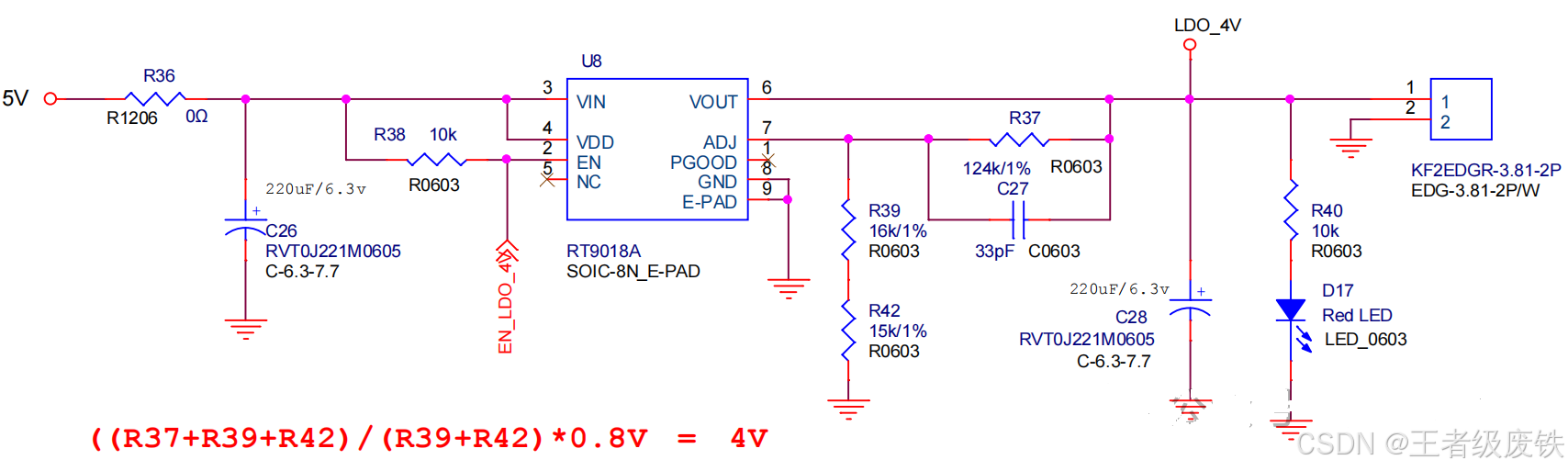 4、RT9018A(降压),5V输入,输出4V/3A(LDO_4V为输出端标识),EN_LDO_4V作为使能控制端。4V电源用的地方较少,但也有需要,比如GPRS模组SIM800C的供电电源需要4V/2A才可以正常工作。特点:压差低可输出大电流