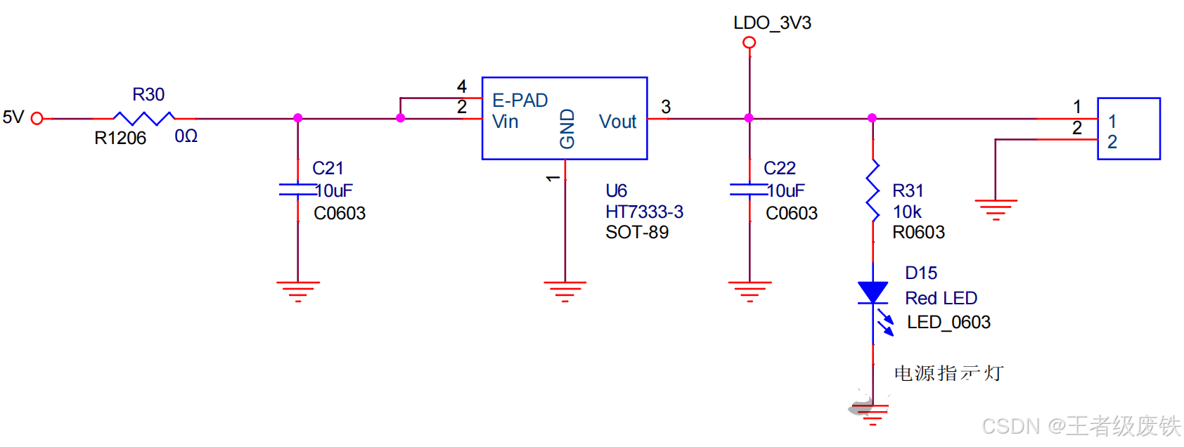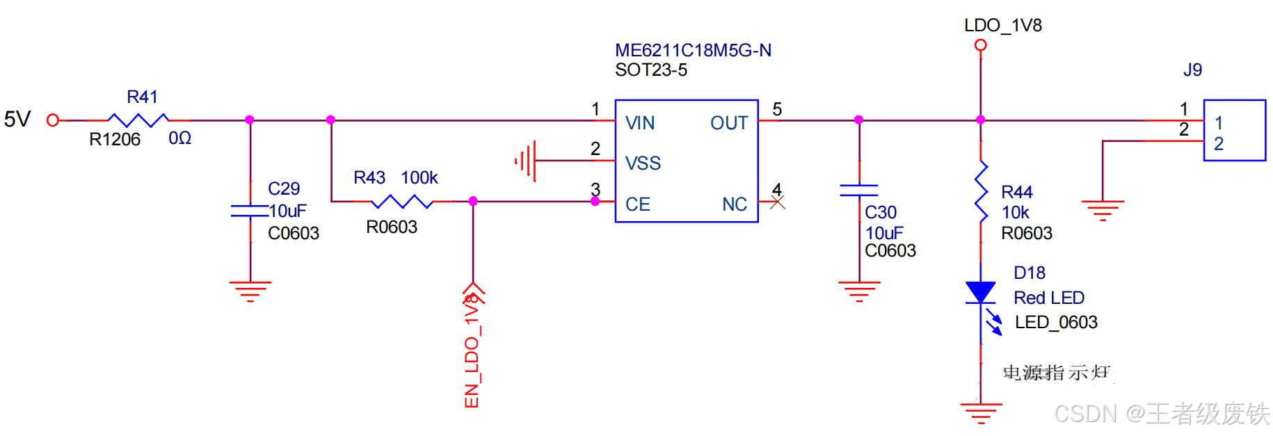 6、ME6211C18M5G-N(降压),5V输入,输出1.8V/0.5A(LDO_1V8为输出端标识),EN_LDO_1V8作为使能控制端。特点:简单,使用方便,稳定
