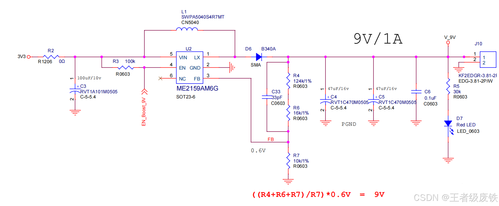 3、ME2159AM6G(升压),3V3输入,输出9V/1A(V_9V为输出端标识),EN_Boost_9V作为使能控制端。用途:可以用于电池升压