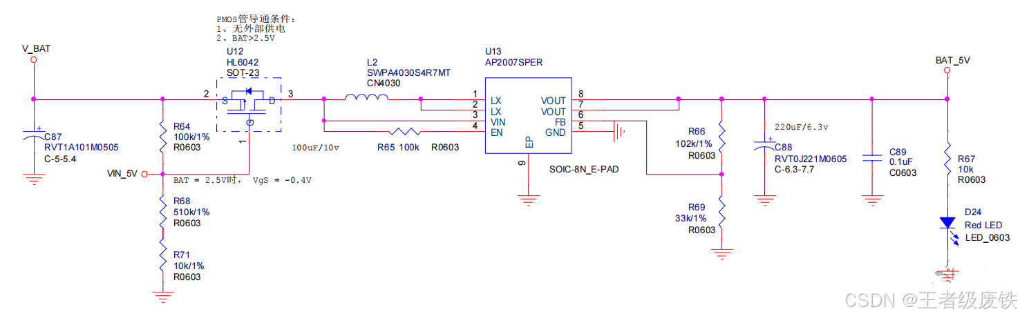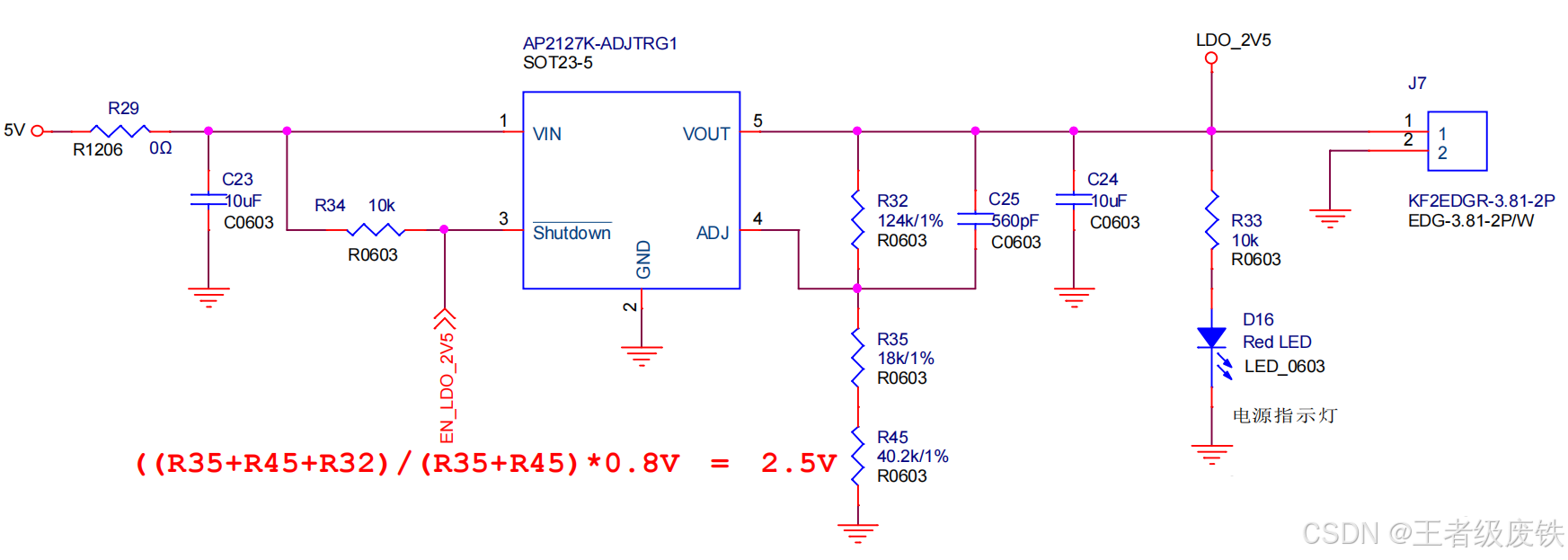 5、AP2127K-ADJTRG1(降压),5V输入,输出2.5V/0.4A(LDO_2V5为输出端标识),EN_LDO_2V5作为使能控制端。特点:输出可调
