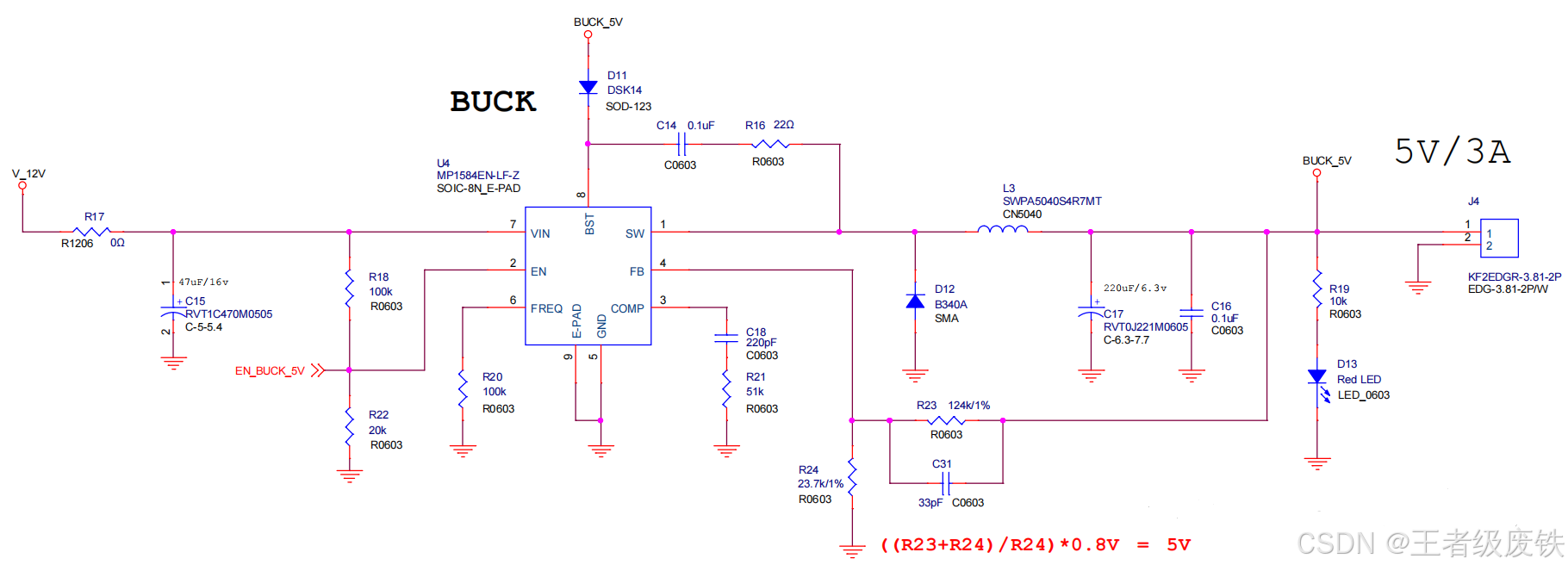 1、MP1584EN-LF-Z(稳压电路),12V输入,输出5V/3A(BUCK_5V为输出端标识),EN_BUCK_5V作为使能控制端。特点:开关频率可调