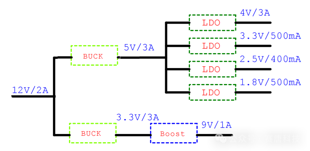 单片机系统中常用的电源主要有:9V,5V,4V,3.3V,2.5V,1.8V,同时不同的电压下,负载需要的电流也不同,因此需要考虑多个方案。以电压12V/2A作为总电源,单片机电源电路系统的整体架构如下图: