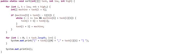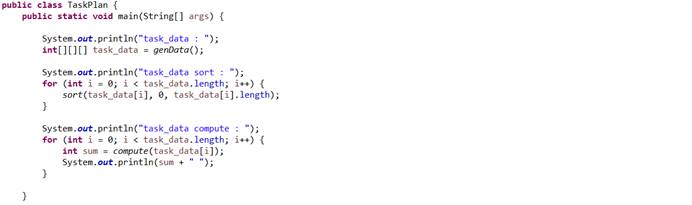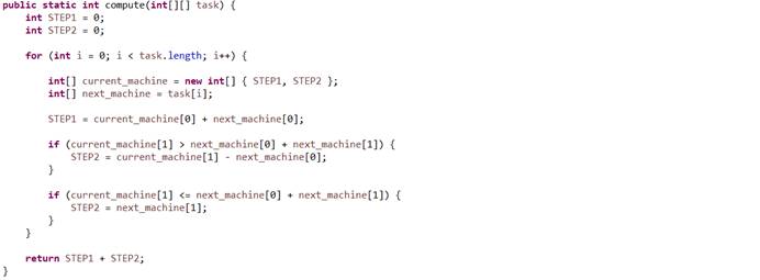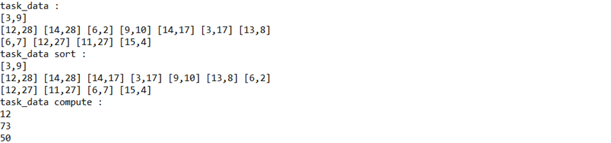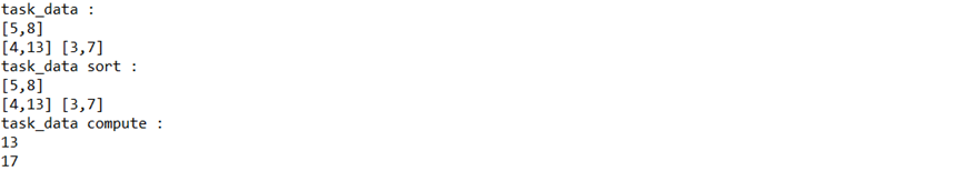 | 配置阶段STEP1是串行任务,在该阶段每台机器是依次执行任务,其执行的总时间不变,运行阶段STEP2是并行任务,在该阶段所有机器是同时执行任务,则执行时间最长的机器应优先运行。 使用三维数组的数据结构保存M组任务的数据,例如,[[[3,2],[2,3]],[[6,6]]],其中 ,第二维数组的元素[[3,2],[2,3]]表示一组任务的详细数据,第三维数组的元素表示每台机器的配置阶段STEP1与运行阶段STEP2的执行工作任务的时间数据,以此类推。 对第二维数组的数组元素的运行阶段STEP2的数据执行大小排序,运行阶段STEP2的执行时间最长的机器应排在最前面,表示优先运行。 计算配置阶段STEP1的任务执行总时间,计算运行阶段STEP2的任务执行总时间,其中,所有机器在运行阶段STEP2的并行执行时间段,只计算一次该执行时间段的时间。 |