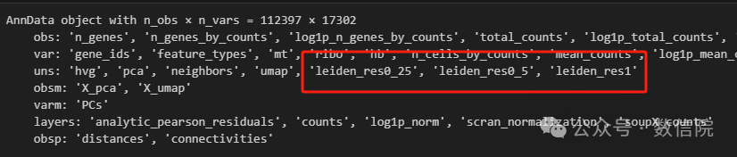 Leiden 模块有一个resolution参数,该参数允许确定分区集群的规模,从而确定集群的粗糙度。分辨率参数越高,聚类越多。该算法还允许通过对 KNN 图进行子集化,对数据集中的特定集群进行高效的子聚类。子聚类使用户能够识别聚类中的细胞类型特定状态或更精细的细胞类型标记,但也可能导致仅由于数据中存在的噪声而产生的模式