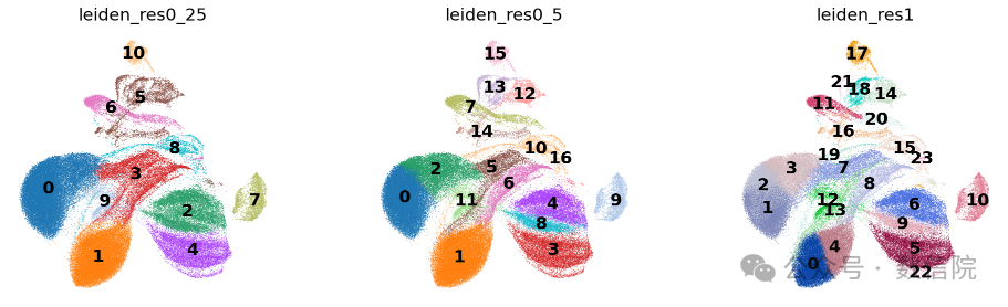 sc.tl.leiden(adata, key_added="leiden_res0_25", resolution=0.25)sc.tl.leiden(adata, key_added="leiden_res0_5", resolution=0.5)sc.tl.leiden(adata, key_added="leiden_res1", resolution=1.0)