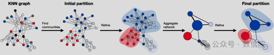 Leiden 算法计算从 PC 约化表达式空间获得的 KNN 图上的聚类。它从一个初始分区开始,其中每个节点都来自自己的社区。接下来,该算法将单个节点从一个部分移动到另一个集团以找到一个分区,然后对其进行优化。基于优化的分区,生成聚合网络,再次优化该网络,直到无法获得进一步的改进,并达到最终分区。